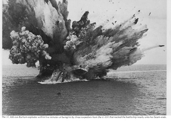 Photo of the H.M.S. Barham exploding. Given to Commander Dennis after the war by Von Tiesenhausen, the Commander of U-331 that sank her. |
