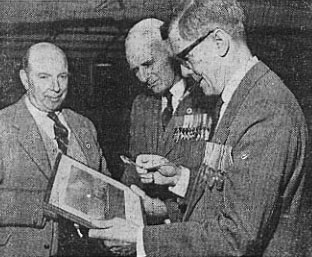 Three survivors of the sinking of the battleship at the H.M.S. Barham Survivors Association gathering aboard H.M.S. President, London, yesterday, to mark the twentieth anniversary of the disaster. From left, Lieutenant J. Coward, Commander A. J. Cobham, G.C., and Commander Stratton Brown. |