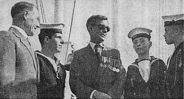 Another ceremony which recalled the war was the presentation of colours yesterday to the War Unit (the Barham unit) of the Sea Cadet Corps. Commander Stratton Brown and Petty Officer Ludwig (left), survivors of H.M.S. Barham, torpedoed in 1941, talked to some of the cadets. |