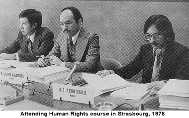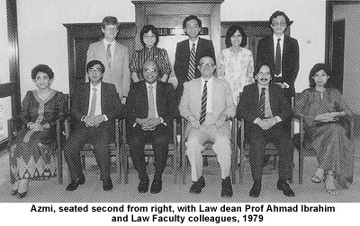 During his younger days, he contributed articles to a children s magazine called The Young Malayan. He had the ambition then to be a journalist but, caught up later with the cause of human rights, he changed his mind. He often sat on the editorial boards of some school magazines. He was an industrious student and participated in many school activities. Azmi attended two different secondary schools; the Sultan Abdul Hamid College in Alor Star and later the Victoria Institution (V.I.) in Kuala Lumpur. He had fond memories of the V.I. where he made many good friends who remained until the end. In the V.I. he was on the editorial board of the school magazine, a committee member of the National Language Society, a school librarian and a member of the school Cadet Corps. He was also a member of the Bahasa Malaysia school debating team, joining seniors such as Rafiah Salim and Wan Ahmad Hulaimi in 1966. ![]() Azmi pursued his legal studies at the London School of Economics (LSE) and the School of Oriental and African Studies (SOAS). While there he joined the Malaysian Students Law Society and served on its committee. He was also on the editorial board of the Society s annual journal Kanun. During his LSE days he was exposed to a myriad of student activities that included demonstrations as well as various social interests that LSE students were so involved in. ![]() Upon his return home to Malaysia, Azmi joined the newly established Law Faculty at the University of Malaya in 1974. During that period the university campus was rocked by student demonstrations and Azmi had to help secure bail for the release of some law students who were caught in demonstrations on and off the campus. Azmi began his teaching career in the area of Public International Law and Constitutional Law. He zealously guarded the teaching of Constitutional Law and was particularly selective in the choice of co-teachers and tutors for that subject. He insisted that anyone who taught that subject must appreciate the underlying principles of the Constitution and Constitutional Law. In fact, when he was on his first sabbatical leave in 1978, he was glad that it was Ariff Yusof, someone who shared his views on the subject, who took over in his absence. At the Law Faculty, the trio of the VI debating team met up again when both Hulaimi and Rafiah joined Azmi. However, the reunion did not last very long; Hulaimi left first and Rafiah followed suit but Azmi remained. It was on the occasion of Rafiah s departure from the Faculty to join Maybank, in 1988, that Azmi had the occasion of reminding her that she was to be literally sitting on the remnant of what was left of Bukit Mahkamah, which Hulaimi had launched a campaign to save. With the departure of Rafiah they split ways but remained good friends. After failing to register a human rights society,