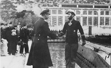 Wearing an oversized homemade decoration presented by his crew, U-Boat Captain Hans-Friedrich von Tiesenhausen (right) accepts the congratulations of his flotilla commander after sinking the British battleship Barham on November 25, 1941. Tiesenhausen soon was awarded a real Knight's Cross for his feat. |
