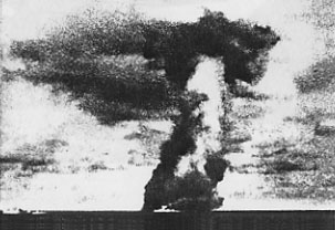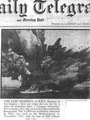Photo of the H.M.S. Barham exploding. Given to Commander Dennis after the war by Von Tiesenhausen, the Commander of U-331 that sank her. |