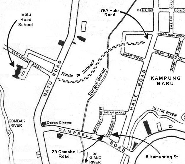 My most exciting memory of this period was not what happened in school but on the way to school. I had to walk through villages and secondary jungle to reach Batu Road School. There was a short cut which involved crossing Sungai Bunus, a tributary of the Klang River. The bridge was a round, 18 inch water pipe, access to which was prevented by coiled barbed wire. I still have barbed wire scars on my arms and left leg near the knee to mark my successes. Whether the river far below was shallow in thirst during the dry season or swollen in anger during the monsoon, I know for a fact that I never once slipped off the pipe while taking tiny steps across it with my arms and hands extended shoulder height for balance. A fall would have banged me up badly during the dry season or possibly drowned me during the monsoon, for I could not swim a stroke! An unhappy aspect at BRS was bullying. My recollection is that I was twelve and I had a Chinese boy