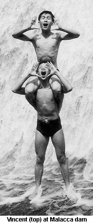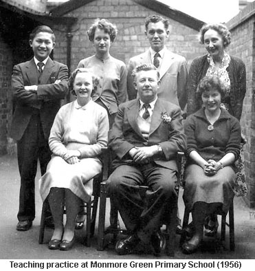 Schools where I did my Teaching Practices: Great Wyrley Secondary Modern School: It was a large three storied building. The Headmaster, Mr David Gardiner, was a friendly man and was well-liked by the staff and pupils. This was a mixed school which also taught metalwork and woodwork. The students ages ranged from twelve to sixteen when they would leave for other institutions technical, trade or straight to work. I spent two days just observing, including the Form 4 girls doing cooking or needlework. Oh, I certainly enjoyed ogling at the girls. This was the first time I had set my Chinese eyes on the English girls, all of them taller than me. I could see that some of them were stealing glances at me. I think I had a likable or handsome face, for they would talk to me later before or after school. A year later one of them visited me in my college room. What transpired I cannot tell you, lah! Later I taught art and maths to the lower forms. No problems from the pupils. In the staff room the teachers were inquisitive, asking me about Malaya and the war years. The Headmaster, too, joined in. We became firm friends and wrote to each other till the last year of his life. He and his wife visited me in PJ in 1986 and I returned the visit in 1992 in Somerset. Greenvale Junior School: This was a small but beautiful school in a small town. The HM, a plump man, was friendly and talkative. Children s ages were from seven to eleven. There were twelve staff, with more females than males. I taught art and craft to the young ones and maths to the ten-year-olds. It was in summer and one afternoon the maths teacher said, "Hey Vincent. It's hot, let s play football." So we took the class to play football. Could we do that at the VI? Nope, but we can do the sports march-past at 2 p.m. Teachers in England were poorly paid. The teachers saw me with my camera and asked if I could take their photos. I obliged and made large copies and gave them free of charge. They were most grateful, including the HM. Rugby Grammar School: Forms 1 6. In the primary schools the 11+ pupils had to sit for the government exam. The 25% who did well would be selected to go to the grammar schools and then to the Universities. Of course some might not make it. I found the pupils in this school very bright and cheeky and talkative. All teachers had to have a degree. All but one me! I taught art and maths to the Form 1. Not all the teachers owned cars. Some rode bicycles and motorbikes and some took the bus. Our own graduates are better off. In this school I hardly saw the Principal walk round the school. When I left I didn t bother to say goodbye to him. I paid a one-day visit to a school for the very slow learners. It was quite an eye-opening experience for me. The teachers were so patient. I salute them. Did I enjoy the experience of teaching in these schools? I certainly did. I was a good mixer, with a good sense of humour and always cheerful. I sang a lot and played my harmonica. As you know we have two brains right and left. I tend to use mostly my right brain. Mr Zimmerman, the US preacher had got me to love music (singing mainly) and had encouraged me to learn to play a musical instrument (any kind). My first choice was the harmonica since I was already knew how to play it. I joined the college choir, attended music appreciation classes and learned to play the recorder and, most important of all, I learned to read music (in my own unconventional way). ![]() Active and strong, I joined the gymnastics club as well as the PE option trainees in canoeing, map reading and rock climbing (I managed to climb Mount Snowdon, England s highest mountain). The P.E. lecturer, Mr Sam Hill, and I became good friends. I joined the music society's choir. We sang Handel s Messiah at Birmingham University. In 1956 the college gave a concert to a large English audience of prominent people. I sang an English folk song I will give my love an apple without e'en a core and played Lysette on my harmonica. I joined the music group and went to Stratford-Upon-Avon to see two of Shakespeare s Plays, Hamlet and A Midsummer's Night Dream. On my own I saw the ballet Swan Lake at Covent Garden, London. I attended three orchestral performances and five Gilbert and Sullivan operas in Wolverhamton. On My Own
