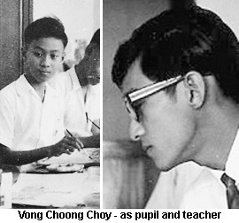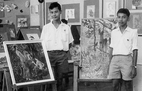 When Mrs. Yiap first became pregnant she had difficulties driving. She asked if I could use her Mini and drive her to school. No problem, I said. So every morning I would ride my scooter to her house and park it there. Then we would both get into her car and I would do the driving. Later when Mrs Yiap had delivered her baby and returned to her teaching duties she again asked me for another favour which was to accompany her to look for a new car. She decided on a small BMW. Later when she became pregnant with her second child, I was asked to play chauffeur again. When Mrs Yiap's two boys grew up they went to the VI where I taught them. They were smart and well-behaved boys. Her husband was a dental surgeon. He once gave me a gold filling without any charge. His workmanship was excellent. Mr Patrick Ng ![]() He was a quiet, intelligent, talented, very mild-mannered and shy man whom I first met when we were members of the Wednesday Art Group. He had many female young artists who would approach him for help, so much so that they began to show signs of his influence in drawing style and thinking just like the apprentices of the old masters. Patrick came to the VI in 1959 and was asked to teach the Forms 1, 2 and 4 classes while I taught the Forms 3, 5 and 6 classes. You could say his classes were the noisiest in the school. Patrick simply could not control the boys. Dr Lewis would sometimes go downstairs to his art class to warn the boys to be less noisy. This fell on deaf eyes and the fish market atmosphere continued. One time Dr Lewis arrived outside the noisy classroom, shook his head and turned around back to his office. Even the VI Headmaster had given up! I would go into his class, pretend to do something there but really I was there to help keep his class quiet. Patrick was a good teacher and his influence was strong. Artists Hajeedar Abdul Majid and Ismail Mustam were his prot g s. These two have become famous in the Malaysian art world. Ismail is the artist of the Mural on the frontage of the Dewan Bahasa dan Pustaka. ![]() Ismail Mustam and Hajeedar Abdul Majid Either he was very shy or had some form of complex because of his effeminate nature, but Patrick very rarely went up to the staff room to mix with the others. So I would go down to the art room, order two cups of tea and some food from the tuck shop and chit chat with him. Strangely enough, at parties with his artist friends, Patrick was funny, sociable and popular with the girls. He passed the Form 6 Malay paper and could write in Jawi. He once wrote an article that was published in the Reader s Digest. His English was excellent written and spoken. We became very firm friends and it was through him that I was introduced to some very good artists. One Friday he telephoned to ask me to visit him the following day at his wooden house in Jalan Pinang. That Saturday morning, I arrived a little early and found the front door closed but not locked. I opened the door, walked inside and tip-toed quietly towards a room with an open door. I nearly burst out laughing at what I saw. There was Patrick, all alone, squatting on the floor and painting a portrait of himself in the nude. And he was stark naked himself! He was not aware I was behind him. I gave him a gentle tap with my toe on a certain delicate part of his body. Patrick jumped up with a loud yelp, then turned around and saw me. I fell on the floor laughing my head off for some lengthy seconds. ![]() Patrick at 1960 Speech Day Art Exhibition Patrick quickly ran to a chair grabbed his pants. He, too, laughed, saying, "Aiya, you naughty rascal!" and gave me a hug. Patrick left the VI when he got a British Council Scholarship for a four-year art course in England. On graduation, he decided to live in England for good. He taught art in a large college. Whenever he returned to Malaysia for a holiday he never failed to buy for me an expensive art book. He never married. In 1992, I had intended to visit him in London only to be told by his sister that he had passed away three years earlier. I had lost a good friend. The Braggart There was this graduate in a certain arts subject who would not hesitate to use bombastic words in his conversations in the staff room. He was very fond of showing off his vocabulary or his knowledge of Shakespeare s works. This was annoyed the other teachers who couldn t be bothered with him but he just could not keep his mouth shut. One morning I was seated next to him when he related something that was annoying another teacher. I figured that I had had enough when I heard Mr Braggart use the sentence "My furiosity was aroused." I pulled out my dictionary and looked up the word "furious" and its derivatives. With the dictionary opened at that page, I brought it to our braggart, saying, "Excuse me. I can't seem to find your word 'furiosity'." Then Mrs Tan Soo Hai chimed in, saying rather loudly, "It's 'fury', lah!". Oh, how Mr Braggart's face turned red on being deflated. I had shut him off that morning. He never talked to me again. Mr C. R. Anantakrishnan ![]() He was a very good teacher who showed extreme concerns for the weak boys. Ananta rarely mixed with the others as his place was away from the main table occupied by the young and noisy teachers. All his maths exercise books were stacked by his table which was near the doorway to the school office. He was well-liked and respected by the others. I felt he was too stressed about his boys. There were too many unnecessary worry lines on his face. At times, Ananta would slap his palm to his head, and say to me, "Aiyo, Vincent, these boys are not working hard enough. They are so weak in maths!" "Sometimes I don t know what to do with them," he lamented, "what shall I do?" My first thought was to tell him to send the boys to the Headmaster. Better not, on second thoughts. I would then bring my coffee and sit next to him and we would talk it over. Mr Yap Chai Seng Mr Yap Chai Seng, nicknamed "Money Man",