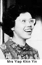 Captain Khiang was there at the jetty. He was brimming with excitement and when he set eyes on Miss Wong he got extremely excited. His speech got faster and faster so much so that droplets of saliva sputtered from his mouth. We went for the very exhilarating and pleasant harbour ride. All the time the captain could not take his eyes off Miss Wong. We were greatly amused. Captain Khiang spoke of his voyages around the world, occasionally turning to the other two girls. After the ride we adjourned to the Sea View restaurant for a good lunch. On the way back to PJ we had a good laugh over the saliva-spewing captain. But my sympathy went to Captain Khiang. Eventually, he found his new partner, a tall, nice lady. Today Wong Yook Ling lives quite close to my house and occasionally goes out with me and Saw Choo Thong for lunch. Mrs Yiap Khin Yin She had a motherly look and a personality
