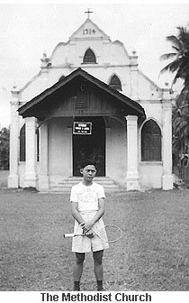 In less than a year we were moved to a long wooden house next to the little Methodist Church with a little field separating the two buildings. My brother and I and another boy were promoted to Primary 1. The building with zinc roof covered with attap was divided into five classes. For toilet we used a small rectangular tall wooden box on stilts about twenty feet from the classrooms. To use it we climbed up a few steps, opened the door, turn around and then closed the door. The night soil collector, a Chinese, would come in the wee hours of the morning to empty the container. Later he would use the night soil to fertilize his vegetables. The three teachers could use the toilet in the little brick house behind the church. A tall Indian named Sam Abraham was our teacher. He was a normal trained teacher. My brother and I were his favourites. We did well and were given a double promotion again. It was really tough but through mother s encouragement we studied very hard. Our days consisted of going to school, doing our homework, memorizing our history and geography notes, house chores, etc. The church later was converted into a two classes. After our promotion we were moved to the class in the church. ![]() Next we attended our first "school", a long attap house divided into three classrooms. I have tried to recall the number of 'quick' promotions my brother and I had but to no avail. I remember at one time it was in the middle of the year when a certain higher class was short of pupils. The HM just told us to go to the class. We obeyed him. We were like parrots - good at memorising. That was how we studied. I remember my fierce grandma once said after caning me, "Hard work wont kill you. But laziness will." First Blood There were five girls in this class led by a tall girl by the name of Tan Ah Leng. My brother, though small, could be quite mischievious. We sat behind the row of girls whose hair sometimes would spill over our exercise books. My brother would pull at the hair and be rewarded with a scolding. One morning my brother shook the long bench while the girls were writing and this really irritated the tall girl who turned around, took off the cover of her flask containing hot coffee and poured it on to his body. He howled. I saw it, left my seat, ran towards her and threw her a hard punch which landed on her left ear. She kicked my tummy which did not hurt and then she landed backward hitting her head against the wall. I saw blood oozing from the ear. The girls marched to see the headmistress in the house behind the church. The gardener cme in and dragged the two of us to the office. The headmistress, Mrs Arumugam, asked us why I had punched the girl who was taller than I by a head. I explained everything and she told me to apologize. I refused to apologize and was given four strokes of a cane which must have been a third the size of the ones used by Dr Lewis and Mr Murugasu in later years. The caning was nothing compared to those given by my grandma. I am sure the girls heard the sounds of the strokes landing on my buttock. My brother and I returned to the class smilng. When we passed the girls I mumbled, "No pain, lah". The tall girl went on to become a teacher in Klang. There were two gangs in the school and I belonged to one. One day during recess there was a fight and we started to throw stones at each other. To dodge the stones being thrown I ran and accidentally knocked my knee cap onto the sharp corner of a large rectangular flower pot. A piece of skin about three centimeters long was left on the corner of the pot. I felt a sharp pain, bent down and looked at the knee. I saw the whiteness of the knee cap. Then blood began to ooze out. Some one took me to the office and the gardener took me on his bicycle to the dispensary near the harbour. I received five stitches without any local anesthetics. I could not bend my knee and was absent from school for about ten days. Today I have a misshapen knee cap. When I returned to school and the girls saw me, they bent their arms and started flapping them like that of the fowls, meaning "Serves you right (tai sei)". My friends the bigger boys would do the same thing but with an addition. They would crow Coocoo coo coo , flap their elbows just like a rooster would do after it had its urge satiated. After a very stern warning and some caning from a very angry Sam Abraham, all fighting and teasing ceased and peace reigned in the school. Off to ACS Klang The church authorities wanted their church back. A lot of the parents were in a dilemma as to their children s future school. There was no secondary school in tiny Port Swettenham I remember there were only four schools in Klang, about five or six miles away the ACS, High School and the Methodist Girl s school. One afternoon on Friday my father came back early and told us that we were going to see the HM of the ACS, which was nearest to our house, some four miles away. When we reached his beautiful big house, I was awe-struck by its size and the plants bearing colourful flowers outside. The HM, a middle-aged man, came out, smiled at us and invited us in. After the usual introductions we sat down on soft seats. Then a lady came out. Oh dear, she was the headmistress who caned me! My initial shock was quickly put to rest as she smiled at us and told us that we were Sam Abraham s favourite students. We were given tasty coffee and cakes. After talking with my father for a while the HM Mr G.S. Arumugam turned to us and asked us some questions. Then he asked Can you two sing? Yes Sir. Then sing me song, he said. Luckily we had learned quite a few evergreens from our parents and the radio. We sang "I m Always Chasing Rainbows." I think we sang well and this pleased Mr Arumugam. HM: "Do you go to church or the temple?" We: "No sir." HM: "Then I want you two to attend our Sunday School in the church. You will learn many things about God and also learn to sing many nice songs." We looked at our father wh