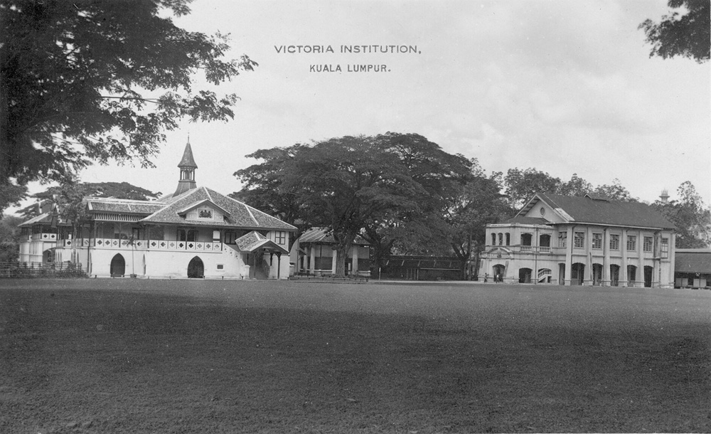 Old VI buildings: Block 1 at left, Block 4 (School Hall) at right, and gymnasium (with pillars) in background centre.